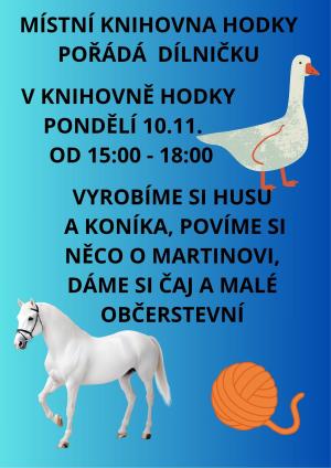 Místní knihovna v Hodkách pořádá v pondělí dne 10.11.2025 od 15 do 18 hodin dílničku. Přijďte si vyrobit husu nebo koníka a popovídat si o Martinovi.