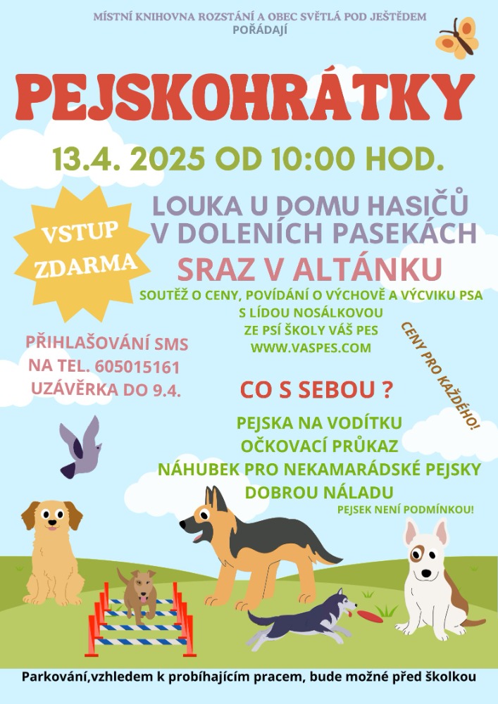 Místní knihovna ve spolupráci s Obcí Světlá pod Ještědem pořádá dne 13.4. od 10 h PEJSKOHRÁTKY na louce v Doleních Pasekách u domu hasičů. Přihlašování na tel. č. 605 015 161.